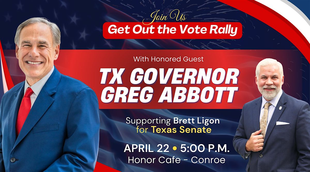 Join Governor Greg Abbott and fellow Republicans in Conroe for a Get Out The Vote rally supporting Brett Ligon, Republican for Texas Senate!
