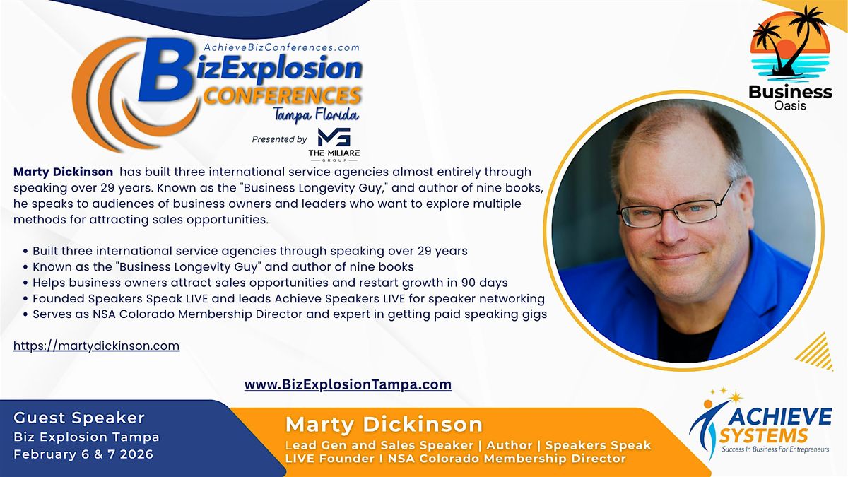 Marty Dickinson has built three international service agencies almost entirely through speaking over 29 years. Known as the "Business Longevity Guy," and author of nine books, he speaks to audiences of business owners and leaders who want to explore multiple methods for attracting sales opportunities so that they can get their business growth plans back on track in 90 days. His clients include Constant Contact, BP Energy, New Zenler, National Association of Professional Organizers, and Colorado Independent Publishers Association, to name a few.