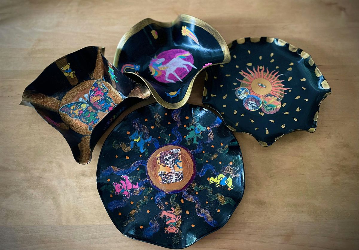 In “Getting Grateful,” we’re diving deep into the vibes of the Grateful Dead and the psychedelic ‘60s to create one-of-a-kind art pieces that are as unique as your own cosmic journey. You’ll be provided with a pre-melted and shaped vinyl record canvas—a funky foundation ready to be transformed into something magical.