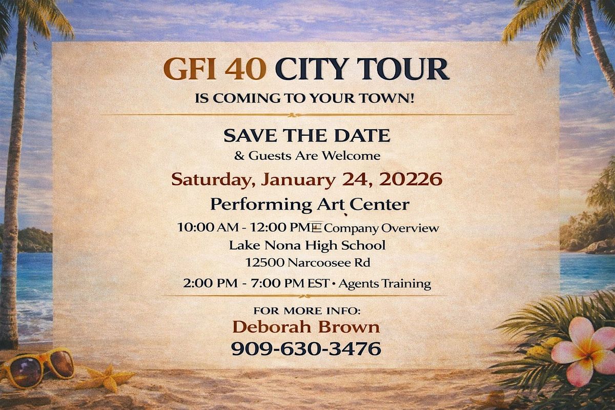 Hey there! Join us in person for the GFI 40 City Tour, an exciting event that’s all about connecting with amazing people. Save the Date | Guests Are Welcome.