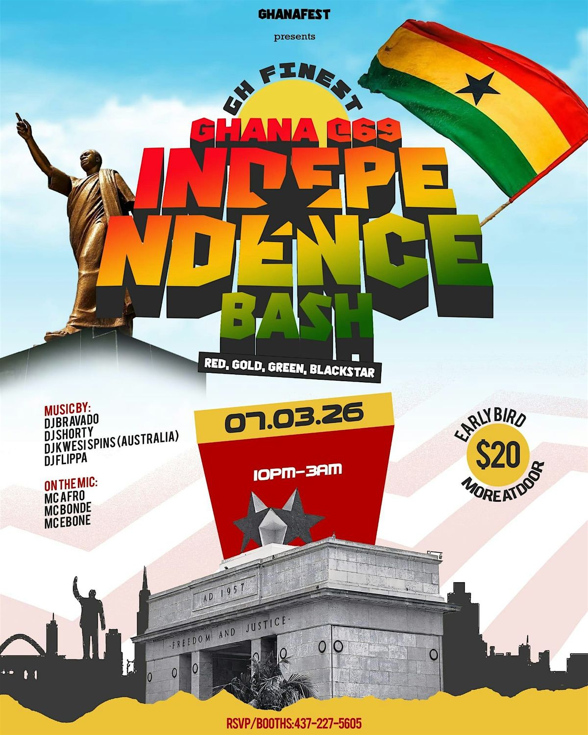 This is more than a party — it’s a celebration of heritage, freedom, and unity. Rock your Red, Gold, and Green and come represent the Black Star in full force!What to Expect:High-energy Afrobeats, Amapiano, Hip Hop & DancehallTop DJs spinning all nightHyped MCs keeping the vibes aliveNon-stop dancing from 10PM – 3AM A room full of culture, pride, and beautiful peopleMusic By: DJ BravadoDJ ShortyDJ Kwesi Spins (Australia)DJ FlippaOn the Mic: MC AfroMC BondeMC EboneDate: March 7, 2026Time: 10PM – 3AMEarly Bird Tickets: $20 (Limited Quantity!)More at the door.Whether you're Ghanaian or just love the culture, this is the ultimate Independence celebration you don’t want to miss.Celebrate freedom. Celebrate culture. Celebrate Ghana.RSVP / Booths: 437-227-5605
