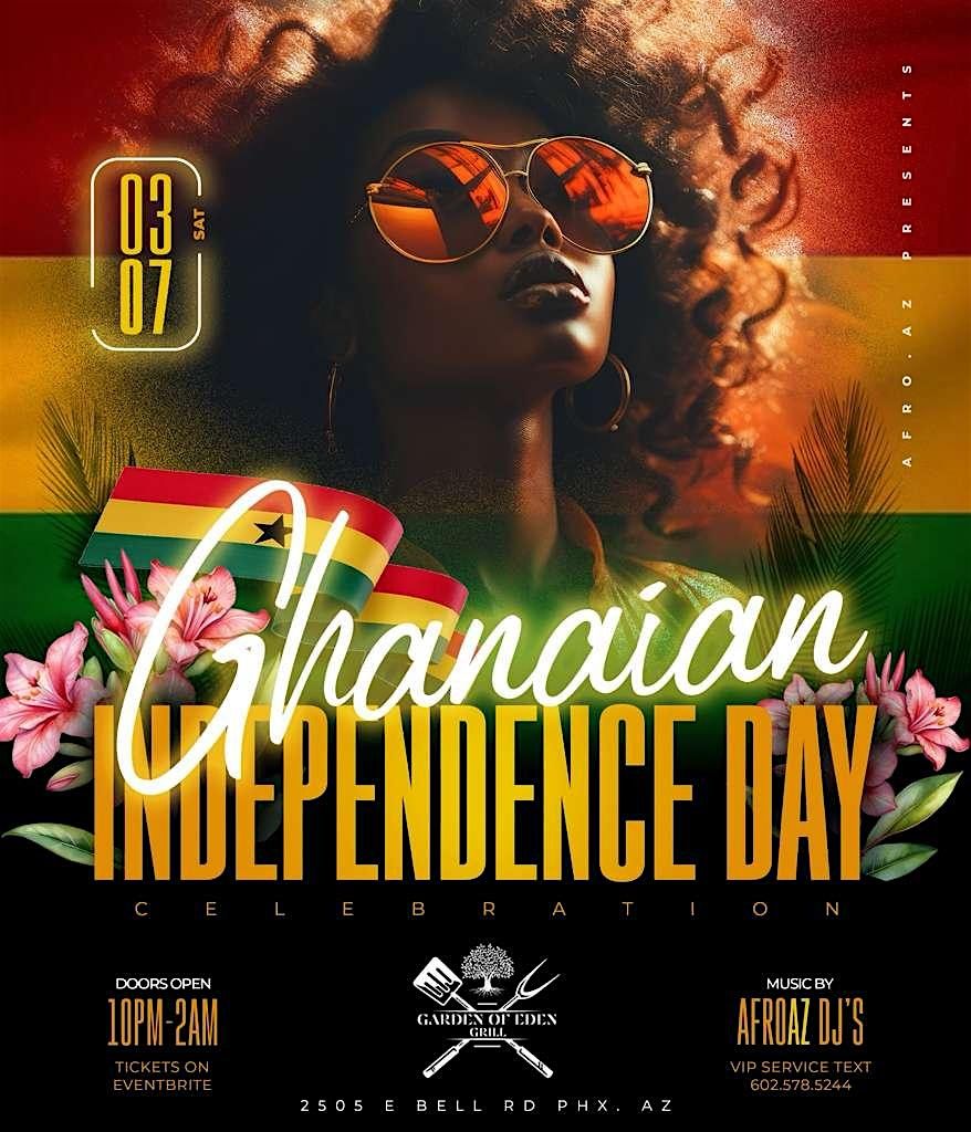 Join us in Phoenix for a vibrant night celebrating the spirit, culture, and freedom of Ghana! Experience an unforgettable evening filled with Afrobeats, high energy, and a community vibe as we honor Ghana’s Independence in style.