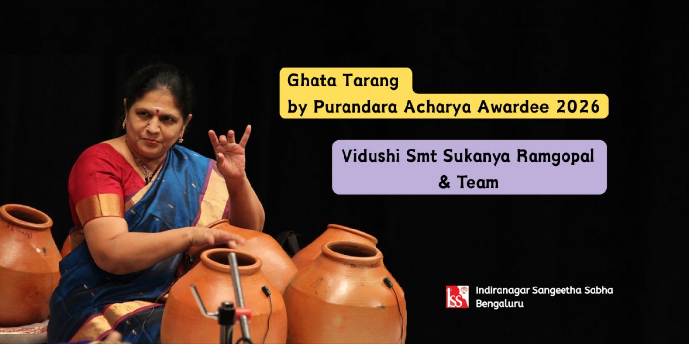 Experience the magic of rhythm like never before! Join us for a mesmerizing evening of Ghata Tarang, a rare and captivating percussion ensemble performed on clay pots, led by the trailblazing Vidushi Smt Sukanya Ramgopal, recipient of the prestigious Purandara Acharya Award 2026.