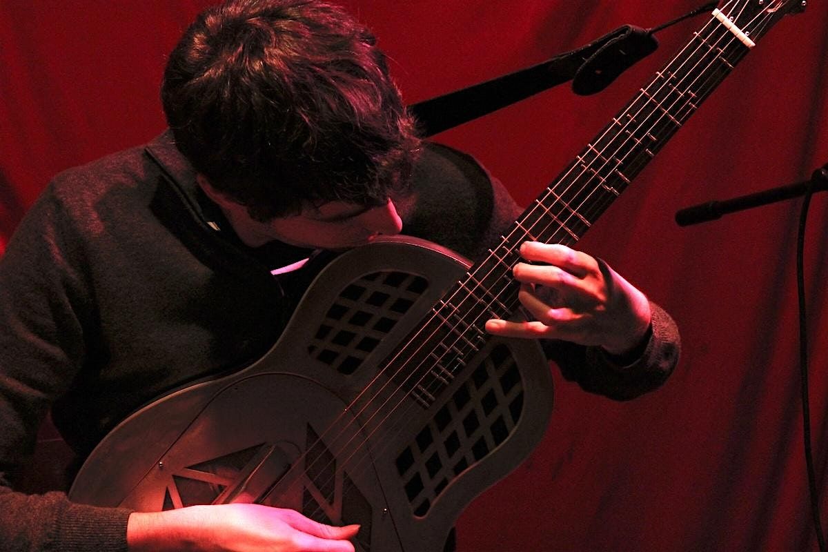 Guitarist GIACOMO FIORE premieres Gift by MATT SARGENT, a set of 13 variations for guitar and electronics on the Shaker tune “Simple Gifts.” The piece was commissioned by Fiore for just intonation resophonic guitar, an instrument originally conceived for the composition of Lou Harrison’s Scenes from Nek Chand in 2002. In Gift, the original tune is buried and unheard an octave below the range of the guitar. What we hear, instead, is music blooming up from the ground that is made out of the harmonics of “Simple Gifts.” As these overtone flowers take shape on the guitar, a ghost occasionally emerges on the right side of the stage, building a halo of resonance around the guitarist.