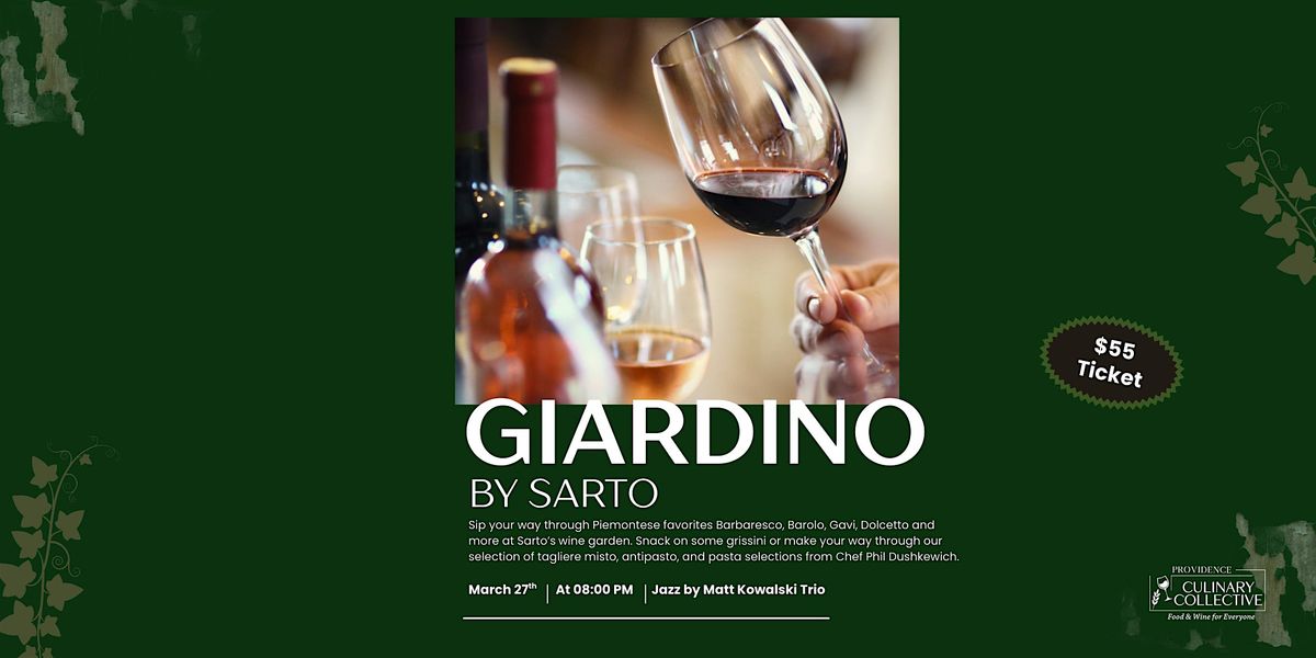 Join us for a special late night wine garden experience at Sarto after dark. Giardino by Sarto is part of the Providence Culinary Collective on Friday, March 27th and starting at 8:00pm, sip your way through Piemontese favorites Barbaresco, Barolo, Gavi, Dolcetto and more. Snack on some grissini or make your way through our selection of tagliere misto, antipasto, and pasta selections from Chef Phil Dushkewich. Light jazz and live music by the Matt Kowalski Trio. This isn't a formal wine dinner, it's a late night escape inspired by terraces and Torino.