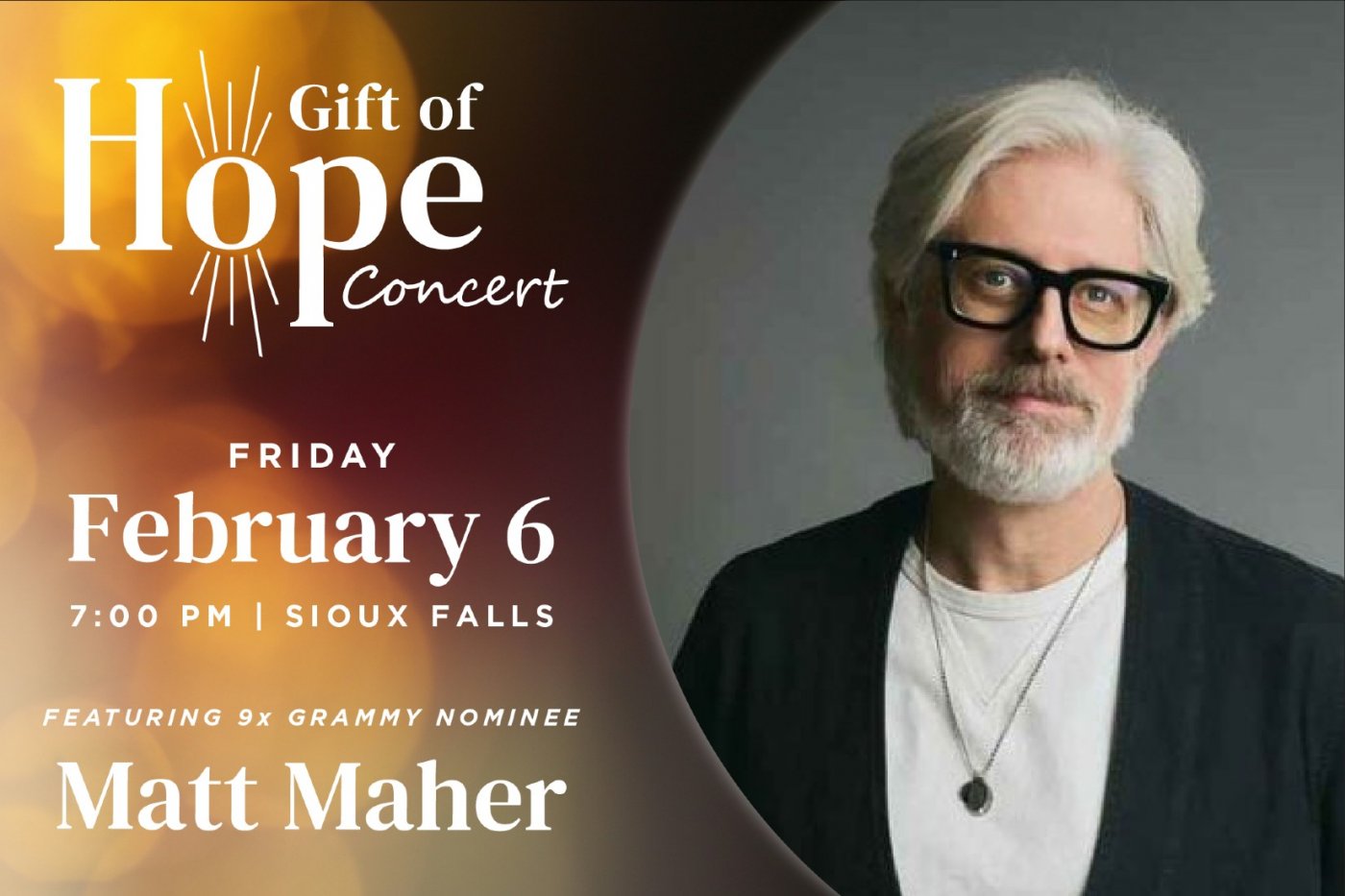 Join us for the 26th Annual Gift of Hope Concert, featuring Christian singer/songwriter and nine-time GRAMMY nominee Matt Maher, on Friday, Feb. 6 at 7 p.m. at St. Michael Church in Sioux Falls.