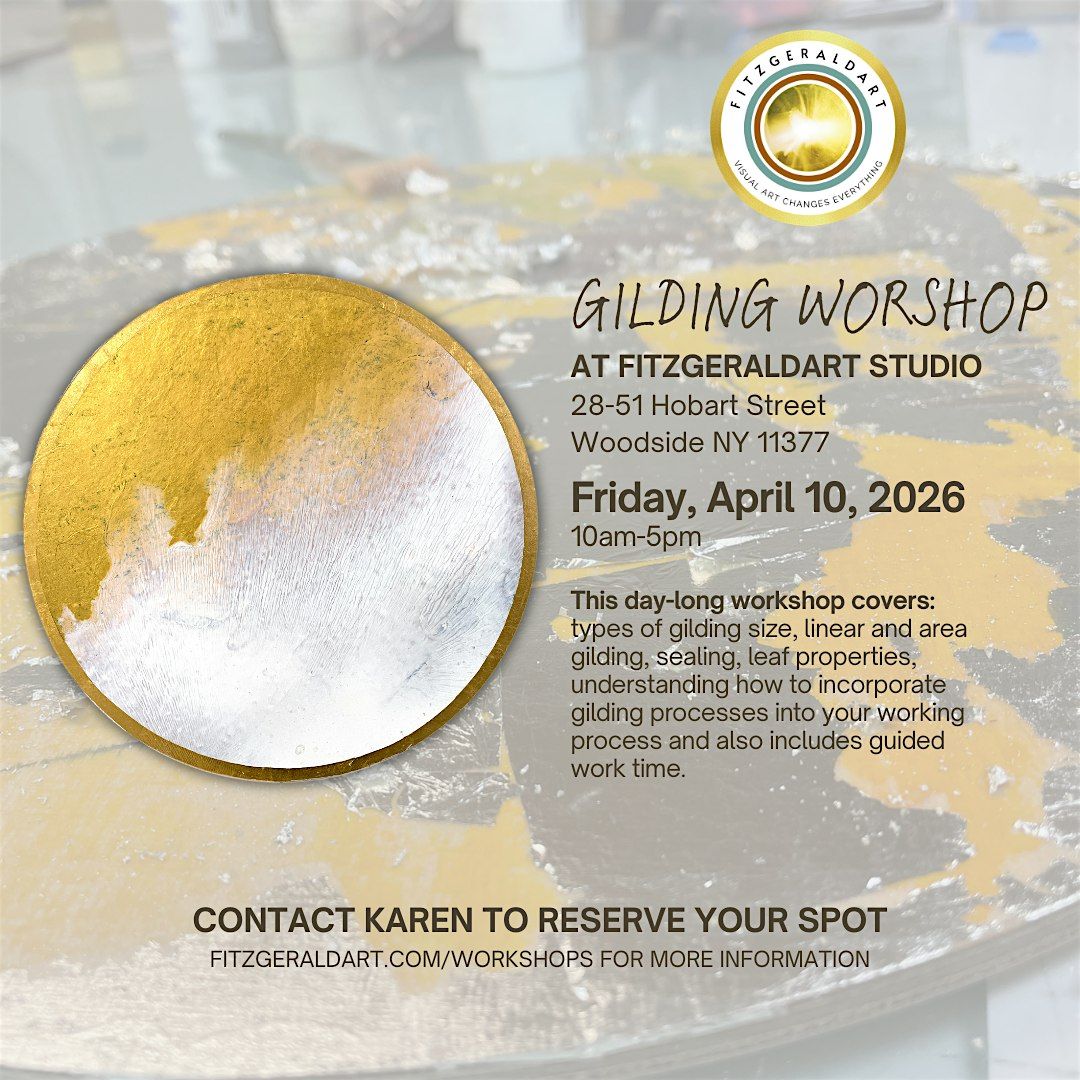 This day-long studio workshop covers sizes, linear and area gilding, sealing, leaf properties, process integration, and guided work time.