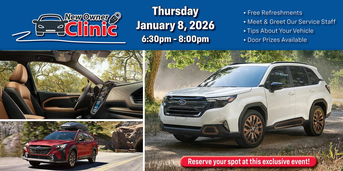 Mark your calendar for our New Owner Clinic on January 8th from 6:30 PM - 8 PM! This will be an opportunity for you to ask any questions you have about your new Subaru and we will be teaching you the ins and outs as well! Food and refreshments will be provided, and we will also have prizes available!