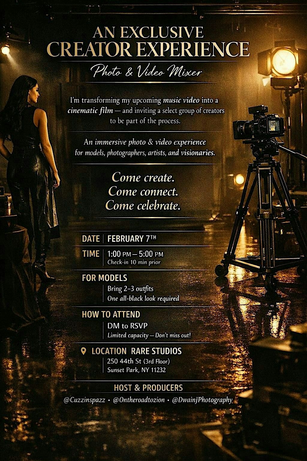 Come ready to mingle with fellow photography and video enthusiasts? Giovanni's Photo & Video Mixer is the perfect chance to swap tips, share your latest projects, and get inspired in person. Whether you're a pro or just starting out, come hang out, connect, and have some fun. Giovanni is looking for models that can bring two to three outfits and one must be all black!