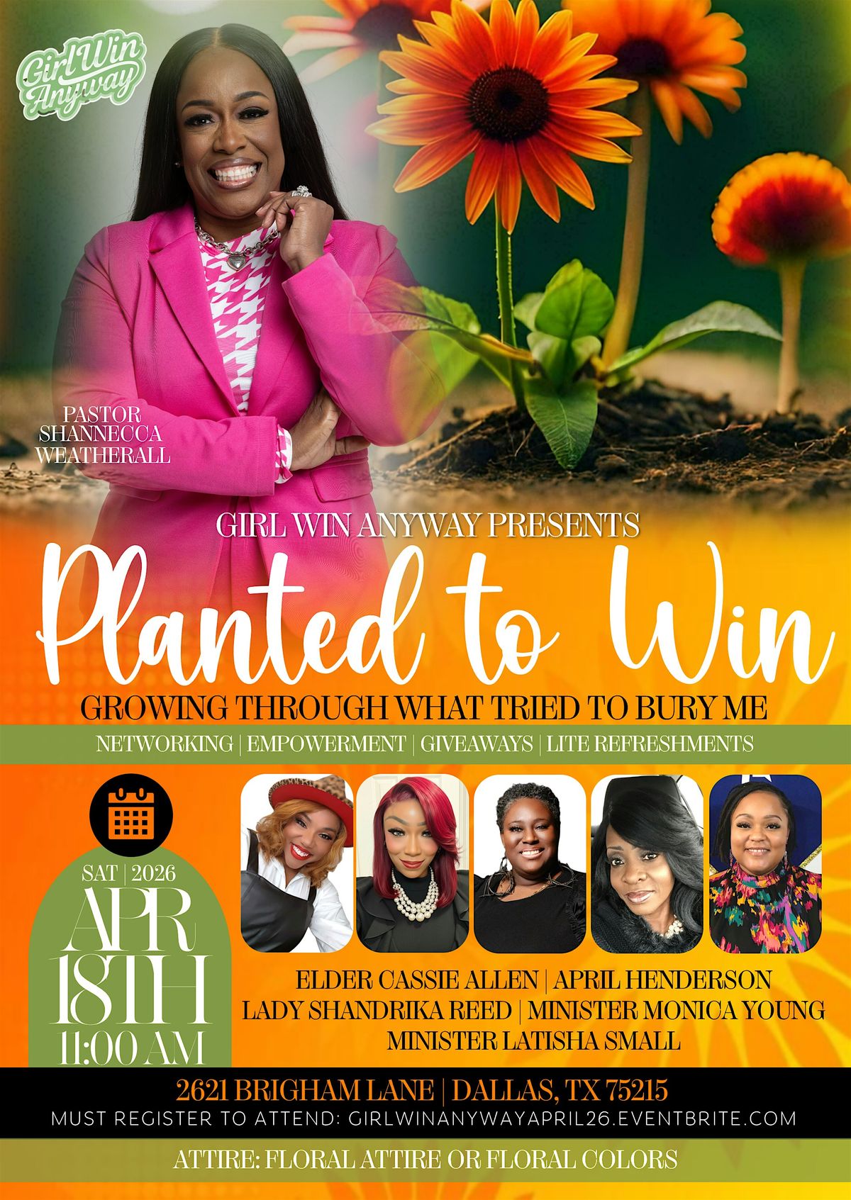 Join us for “Planted to WIN: Growing Through What Tried to Bury Me,” a Garden Party experience designed to empower women to turn pressure into purpose. Through powerful testimonies, inspiration, and connection, you’ll be reminded that what tried to bury you is actually planting you for growth, transformation, and your next WIN.