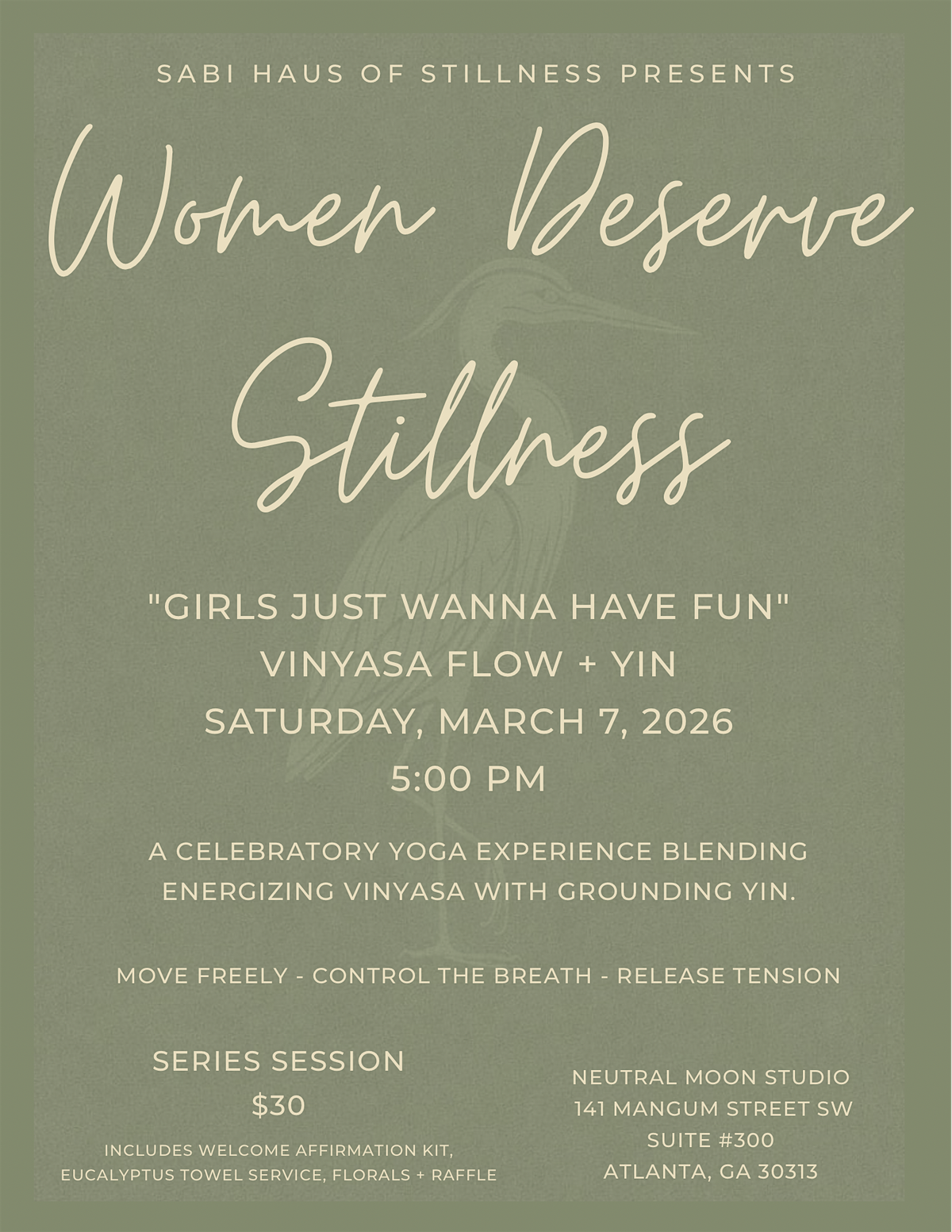 Girls Just Wanna Have Fun, presented by Sabi Haus of Stillness, blends fluid vinyasa yoga with grounding yin yoga to create connection, release, and rhythm.