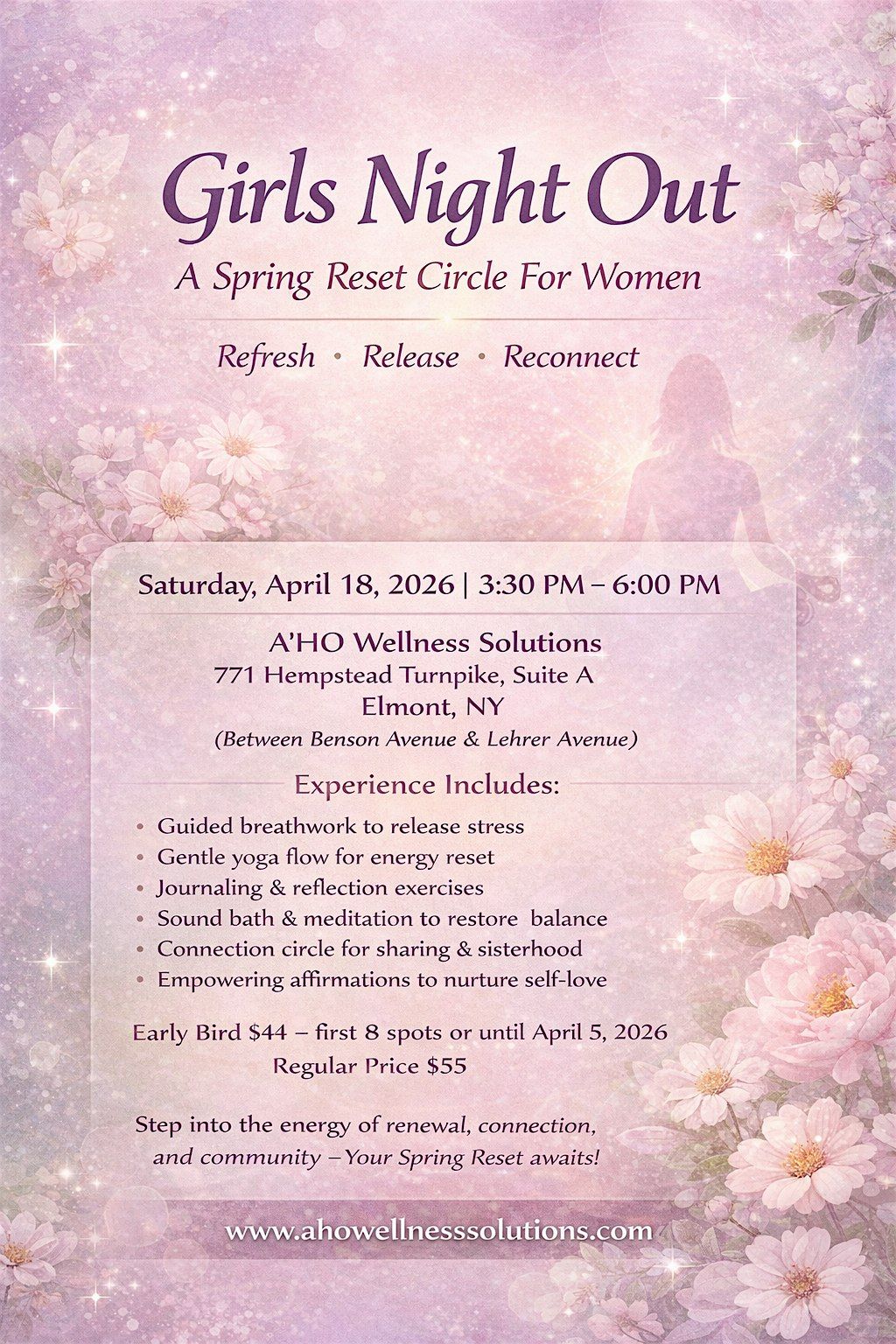 Join us for a fun and relaxing afternoon to reset and recharge with amazing women! We'll gather at A'HO Wellness Solutions Yoga 771 Hempstead Turnpike suite a on April 18, 2026 at 3:30 PM (Eastern Time). Event includes, Gentle Yoga flow for energy reset, Sound Bath and meditation to restore balance, Journaling and reflection, Light refreshments and healthy snacks, connectione circle for sharing and sisterhood, Expect good vibes, great conversations, and a chance to refresh your spirit this spring. Don’t miss out on this perfect girls night out to unwind and connect!