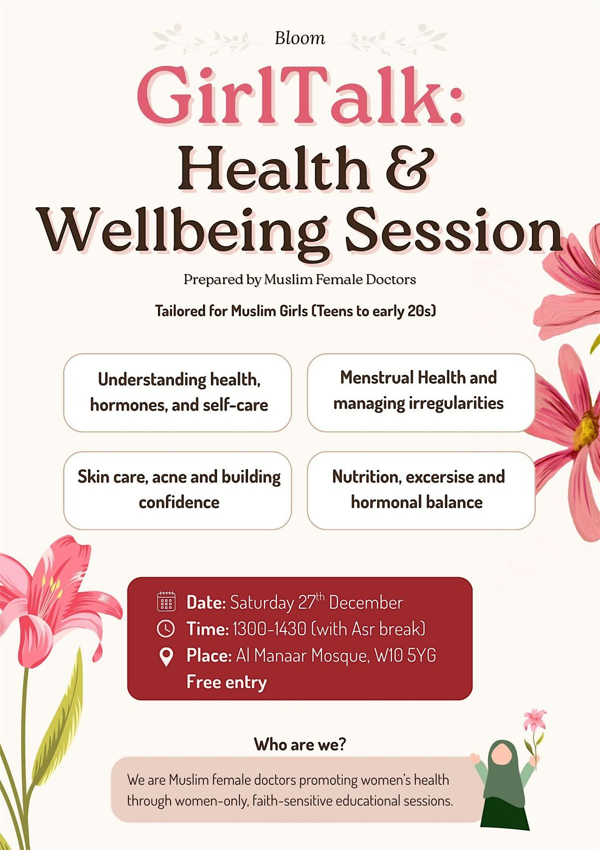 Join us for GirlTalk, a fun and friendly in-person session all about health and well-being tailored just for Muslim girls. We are Muslim female doctors promoting women’s health through women-only, faith-sensitive educational sessions.