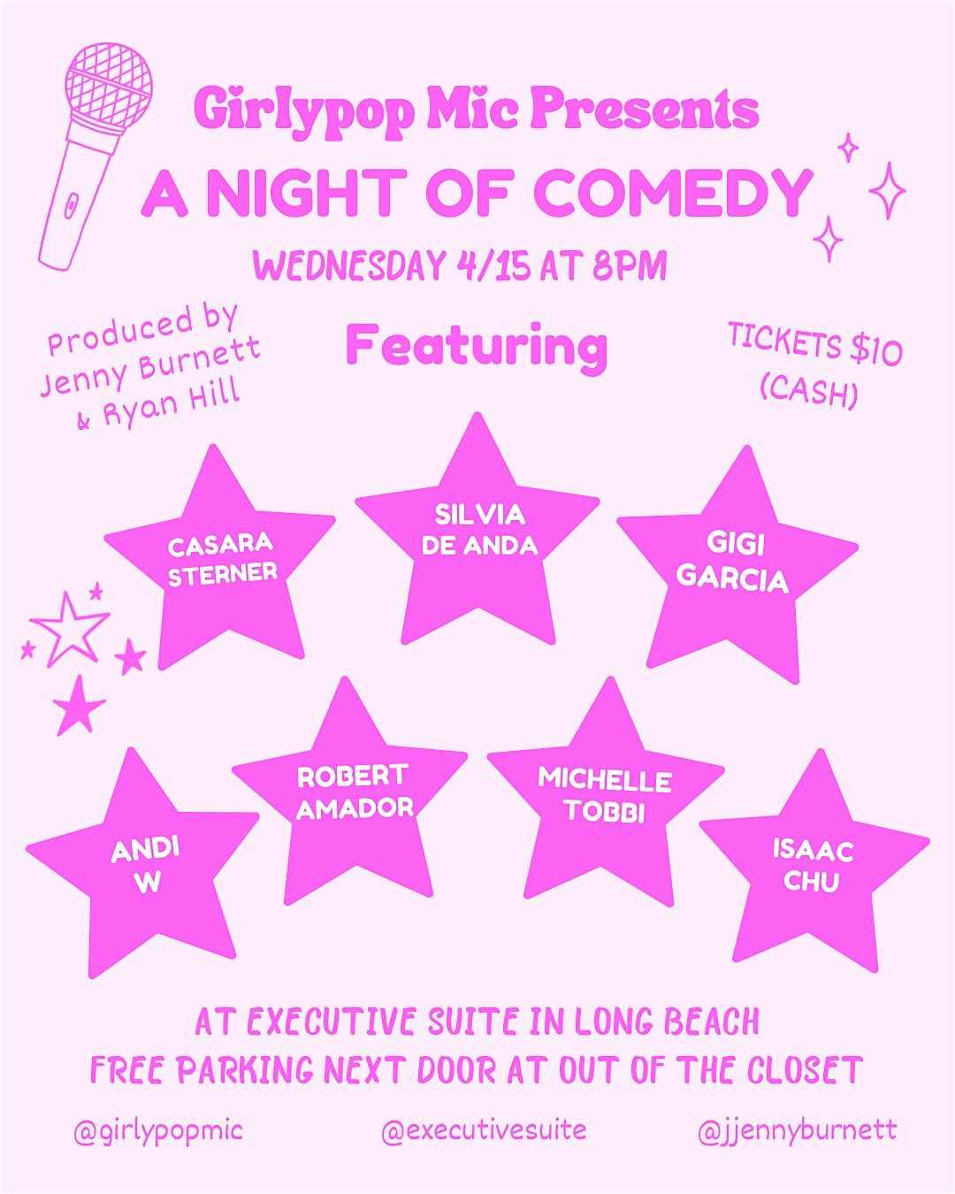 Looking for a diverse comedy show with amazing vibes!? Join us for a night packed with laughs at the Girlypop Comedy Show, featuring LGBTQ+, women, and POC comedians! Tickets are $10 cash at the door. Grab your e-ticket here. Free parking next door at Out Of The Closet thrift store. Follow @girlypopmic & @jjennyburnett on Instagram for updates!