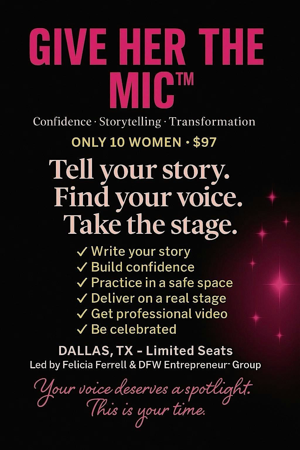 GIVE HER THE MIC is where women stop shrinking and start shining. This event helps first time and rising speakers step into their power, tell their truth and own the room. If you're ready to transform your voice into impact this is your moment(Central Time)