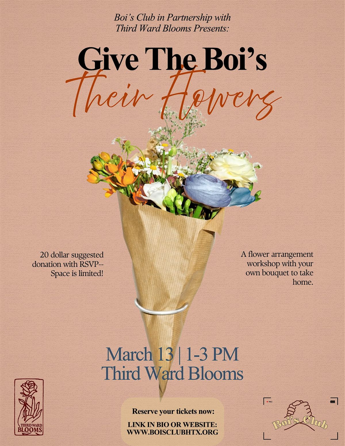 Flower arrangement workshop at Third Ward Blooms where we'll learn how to make a bouquet and take one home! The Boi's deserve their flowers.