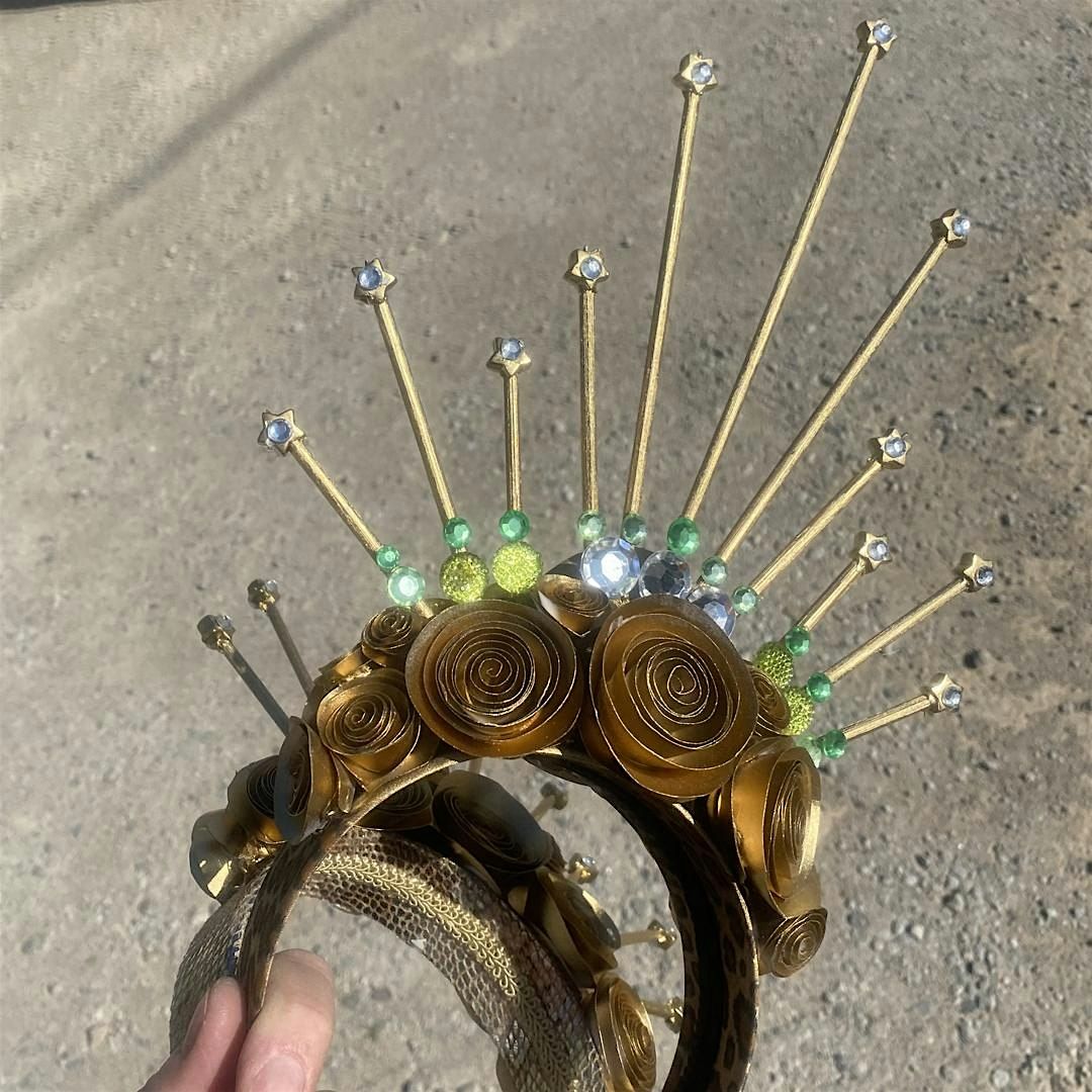 Create wearable art! Design your own red-carpet worthy sunburst crown with all supplies included. Each student will design and complete a unique and show stopping golden tiara. This hands-on workshop will use die-cut spiral flowers, wooden skewers and a whole lot of hot glue. The assemblage will be spray painted gold and then embellishments will include beads and stick-on jewels. Sign up with a friend and enjoy the morning preparing to be FABULOUS! Light snacks and drinks provided (including coffee!)
