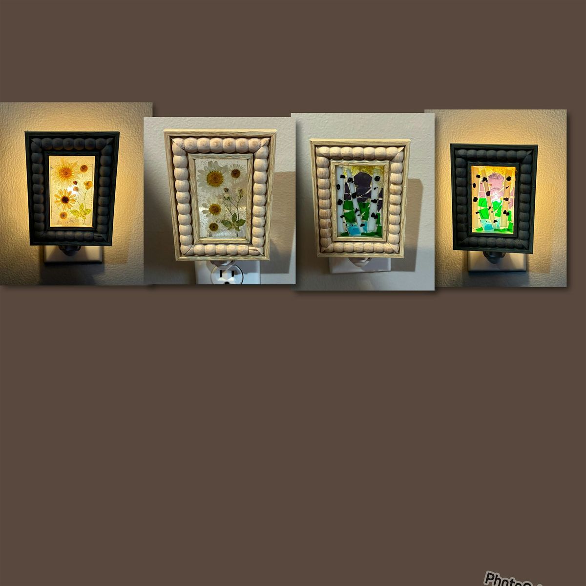 Project includes two night lights and your choice of design with glass pieces ir dried flowers. Then finished off with resin