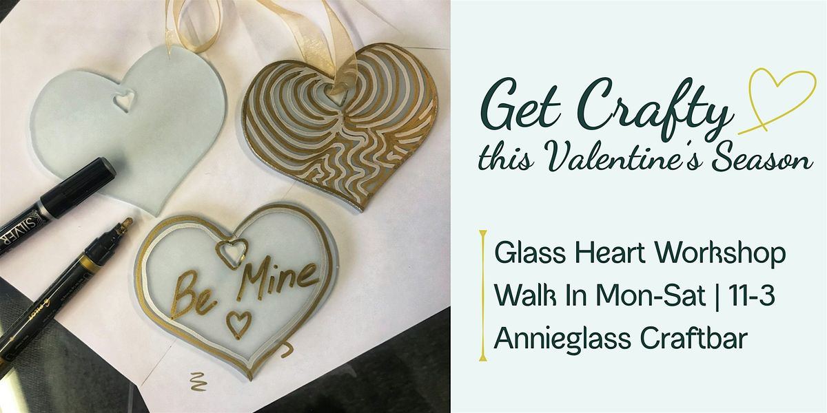 We're offering our Glass Hearts Workshop as a DIY walk-in. Design and decorate two frosted glass hearts using gold, silver, red, and pink paint pens for a truly personal touch.
