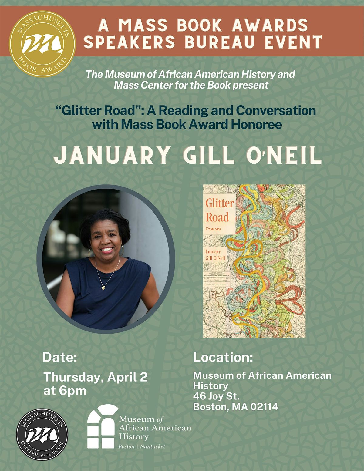 Join the Museum of African American History for an evening with January Gill O’Neil, author of Glitter Road, a Massachusetts Book Awards Honors title in poetry. O’Neil will read from her celebrated collection and speak about the legacy of Phillis Wheatley alongside the landscape of contemporary Black women’s poetry in Boston and across Massachusetts before opening the floor for an audience Q&A and book signing.