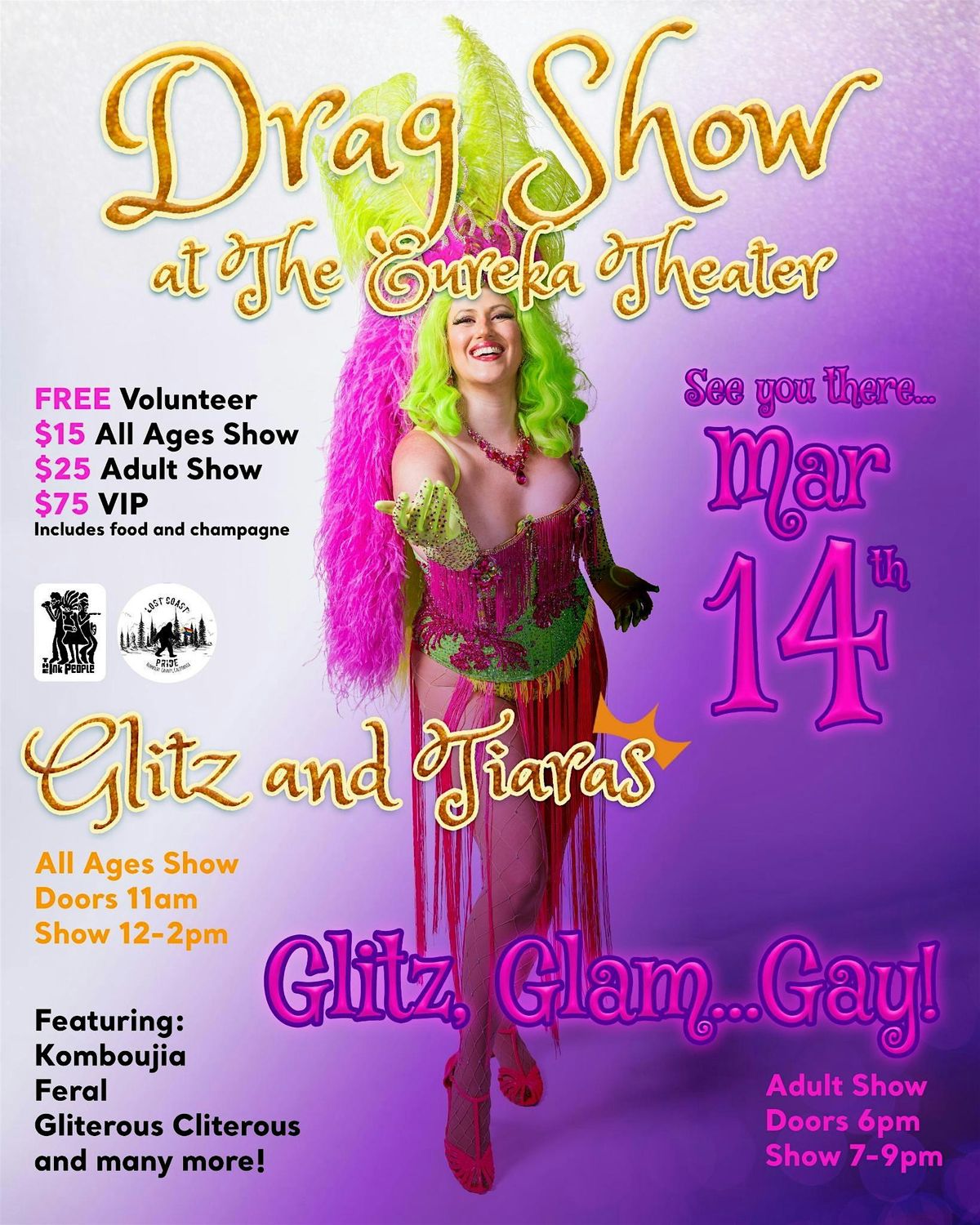 Bring the whole family for a joyful, high-energy drag show filled with music, comedy, stunning costumes, and larger-than-life performances! This show celebrates self-expression, creativity, and community in a fun, inclusive environment suitable for all ages.