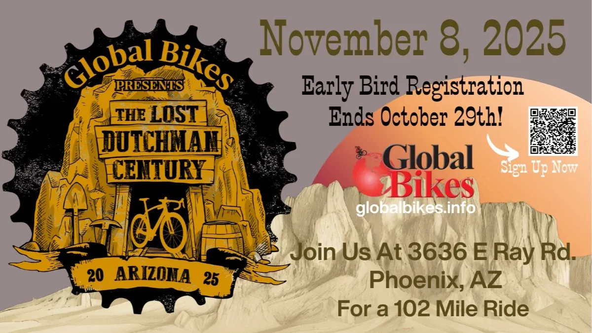 Global Bikes is excited to host the Lost Dutchman Century (102-mile Ride) on November 8, 2025, from Global Bike Shop in Ahwatukee. This is the perfect event for those of you looking to accomplish a century ride with support.