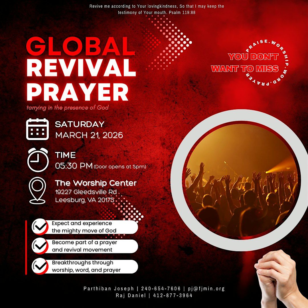 We warmly invite you to join us in person for the Global Revival Prayer on Saturday, March 21st at 5:30 PM (Eastern Time). Please come with your family and invite your friends as we gather together in the presence of God.