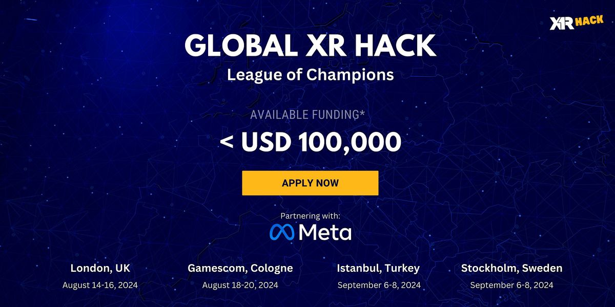 XR Hack is the first global XR Champions League, inviting over 500 XR and AI developers to join our on-site Hack locations in Cologne right before Gamescom, London (Innovate UK Immersive Tech Network, PwC), Stockholm (Vinnova), or Istanbul (Bug Lab). The Hack is organized by XR Bootcamp, which partners with Meta and provides up to 100,000 USD in available funding. Corporate partners provide real-world industry challenges with additional prizes. Hackers are invited to hack using the latest XR and AI tech stacks released over the past 11 months and get matched with corporate XR tech decision-makers.