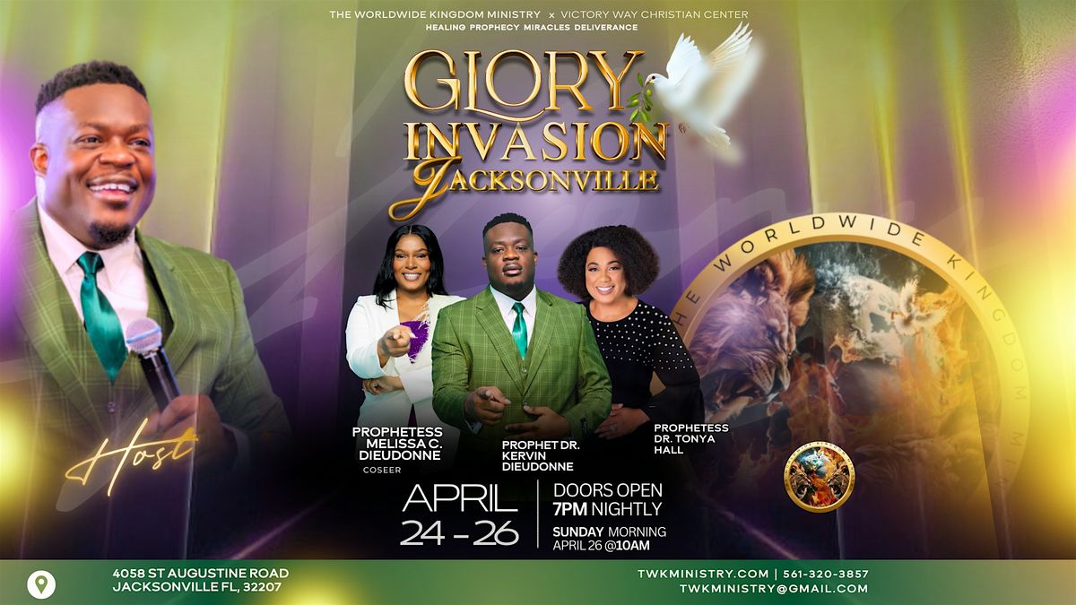 Glory Invasion Jacksonville is a life changing, three day revival encounter marked by healing, prophecy, miracles, and deliverance. Glory Invasion is founded by the honorable Bishop-Elect Prophet Dr. Kervin Dieudonne who has been preaching the gospel for 18 years in many different regions bringing a dynamic prophetic voice and splendid fire. This Crusade will also be hosted by Bishop-Elect Prophet Dr. Kervin Dieudonne and Prophetess Melissa C. Dieudonne, in partnership with Victory Way Christian Center. This divine gathering is designed to usher attendees into a tangible experience of God’s glory and power.