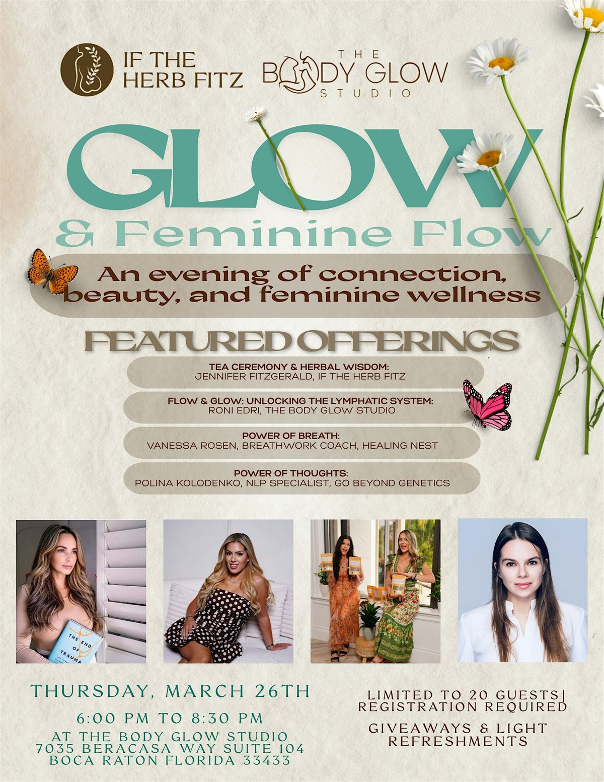 Thursday, March 26th 6- 8:30 pm at The Body Glow Studio (Located near the Chase Bank on the NW corner of Palmetto & Powerline.)
