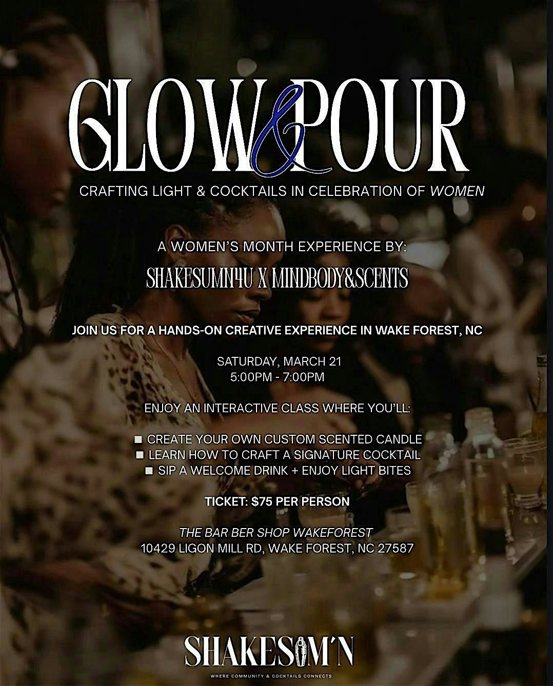 Glow & Pour is a collaborative experience by Shake Sum’n and Mind, Body, & Scents — two brands dedicated to crafting atmosphere, intention, and elevated moments.
