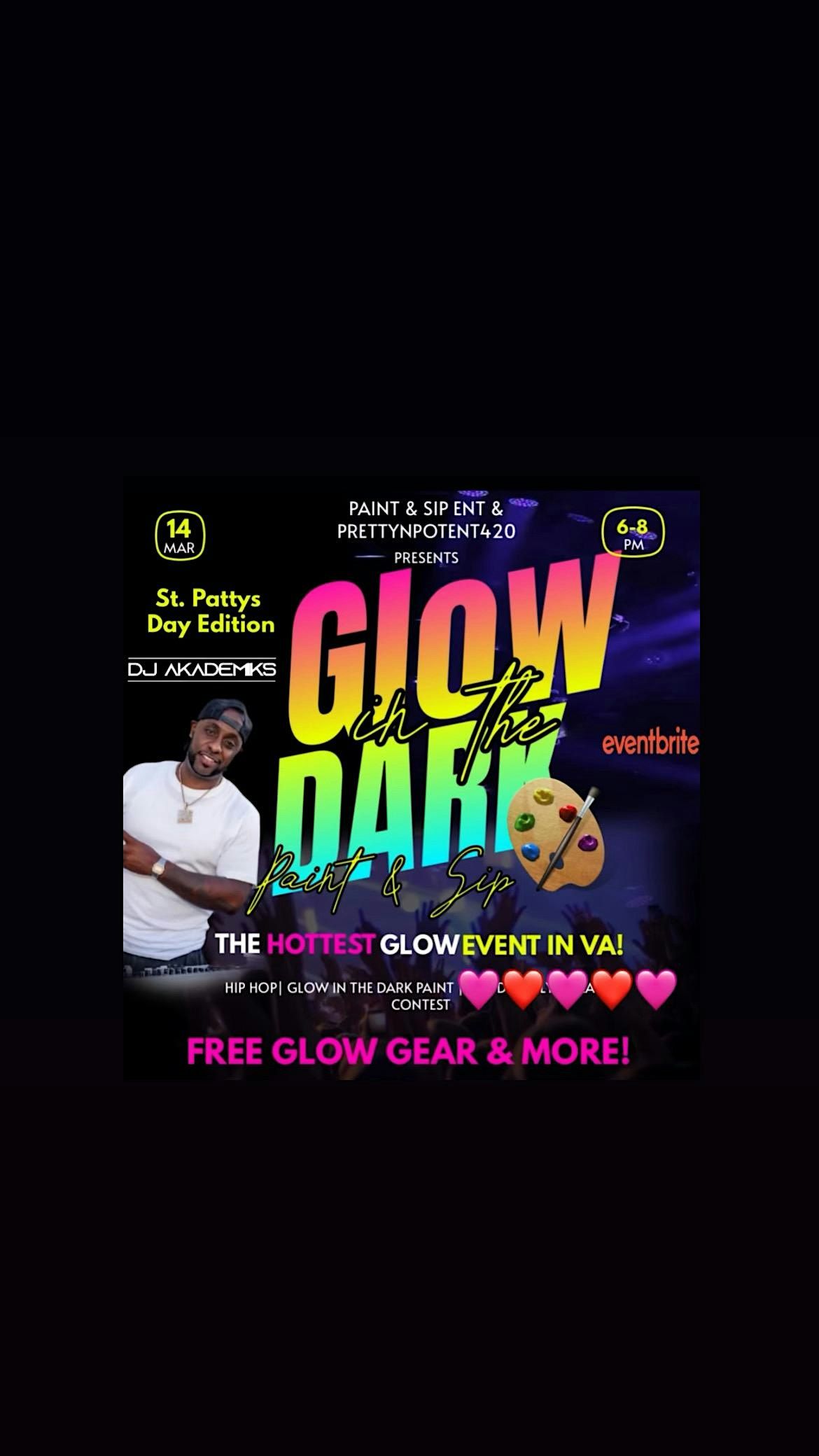 Join us on **March 14th from 6–8PM** for the HOTTEST glow experience in VA! We’re turning the lights down and the vibes ALL the way up for a one-of-a-kind **Glow in the Dark Paint & Sip** you don’t want to miss.