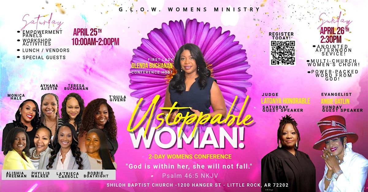 Welcome to the G.L.O.W. Women's Ministry - 2026 Women's Conference: Unstoppable Woman! You were not created to be stagnant, fearful, or defeated! Join us for a powerful life-transforming gathering designed to ignite faith, restore strength and awaken the unstoppable purpose and promise God has placed in every woman. Come connect with like-minded individuals, learn from inspiring speakers, and leave feeling ready to conquer the world. After a transformative Saturday, join us Sunday at 2:30 pm for a great time of praise and worship! Don't miss out on this amazing opportunity to rise, advance and embrace the victory guaranteed when God is with you!