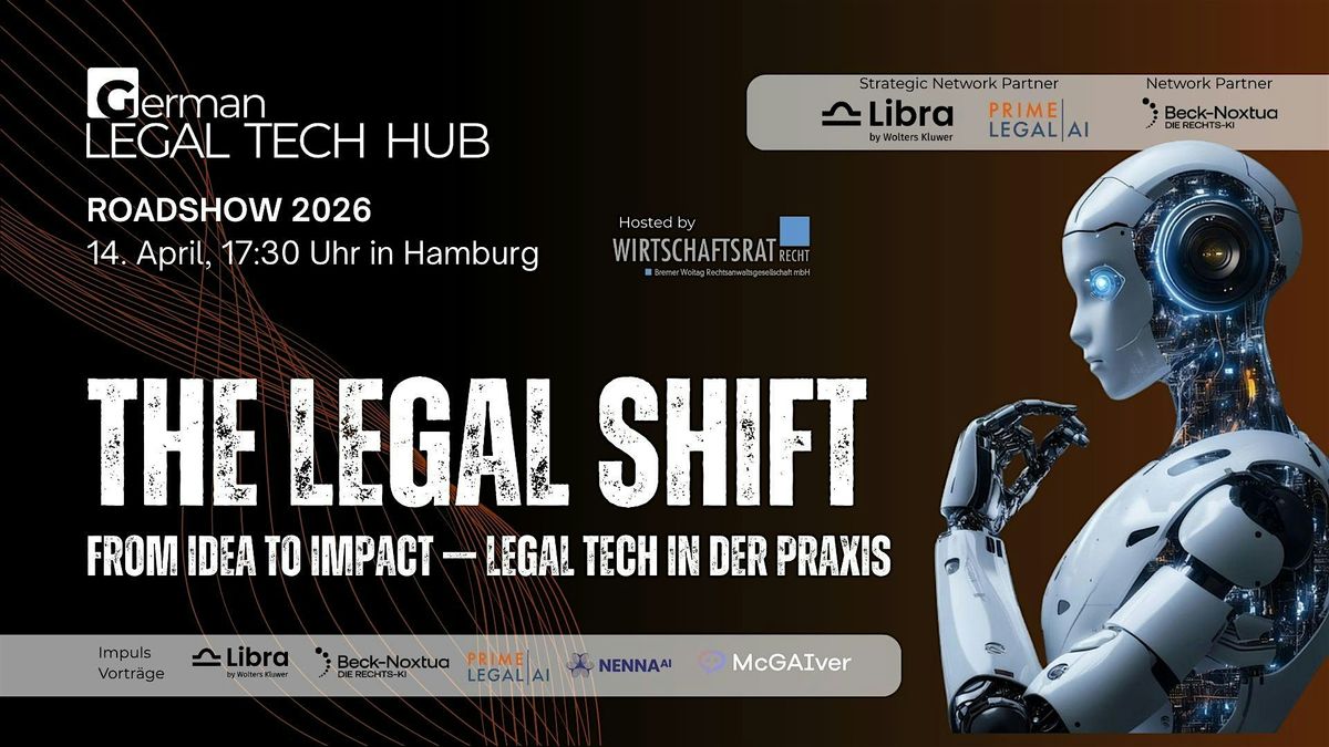 Der German Legal Tech Hub lädt gemeinsam mit WIRTSCHAFTSRAT RECHT Bremer Woitag Rechtsanwaltsgesellschaft mbH am Dienstag, den 14.04.2026, ab 17:30 Uhr zur Veranstaltung in Hamburg ein. Das Ende ist gegen 21:30 Uhr geplant.