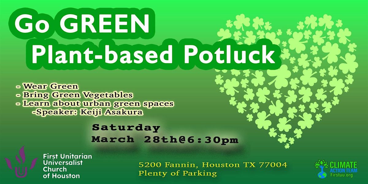 Join us for a fun and relaxed evening at the First UU Church on March 28, 2026 at 6:30 PM (Central Time). Bring your favorite plant-based dish to share and enjoy great company, tasty food, and good vibes. Whether you’re a vegan pro or just curious, this potluck is all about celebrating delicious, eco-friendly eats together. After dinner we'll hear from landscape architect, Keiji Asakura, who will speak on urban green spaces. See you there!