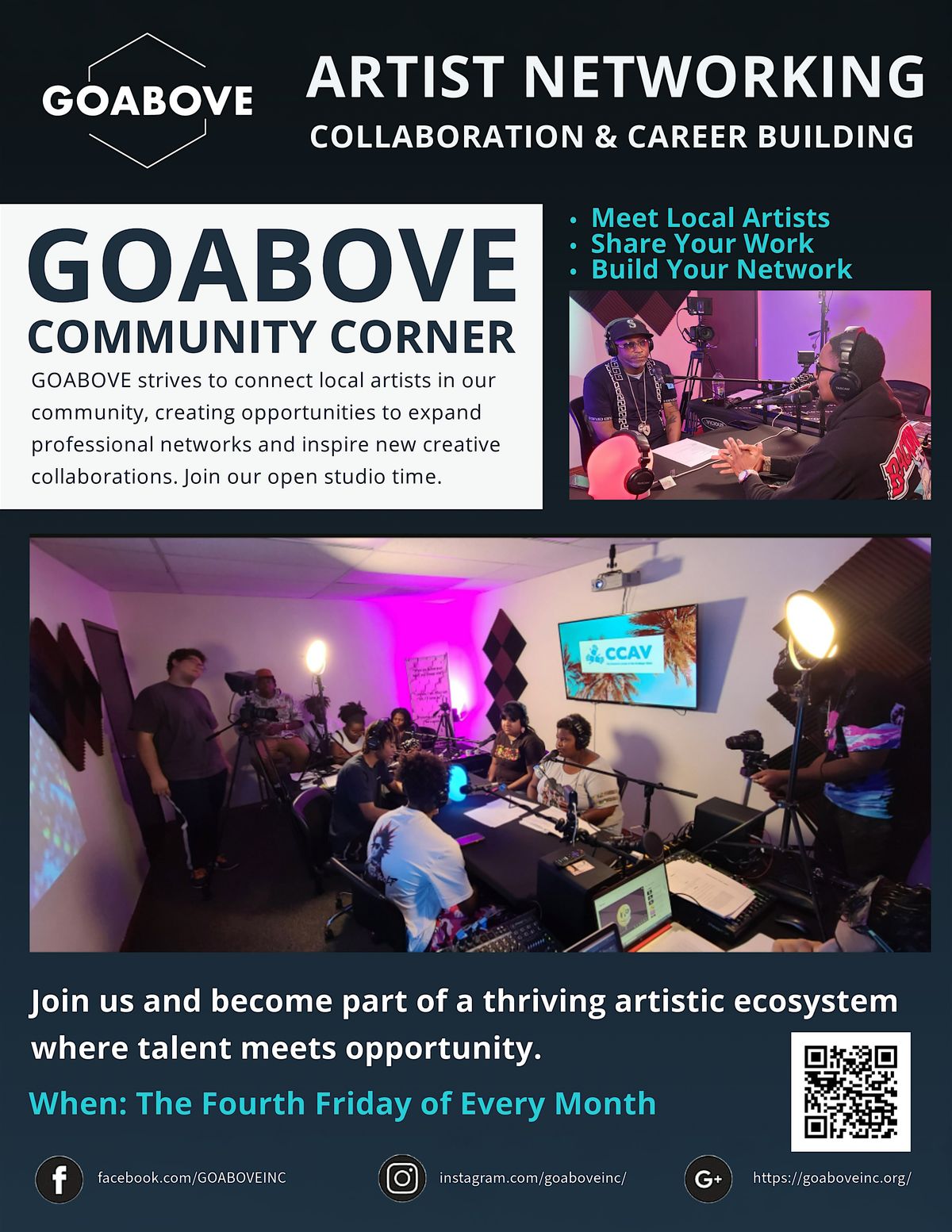 This is your chance to connect, collaborate, and grow at the GOABOVE Community Corner. Whether you're a musician, artist, content creator, or creative visionary — this is where talent meets opportunity. Meet local artists. Share your work. Build your network. Build real connections.