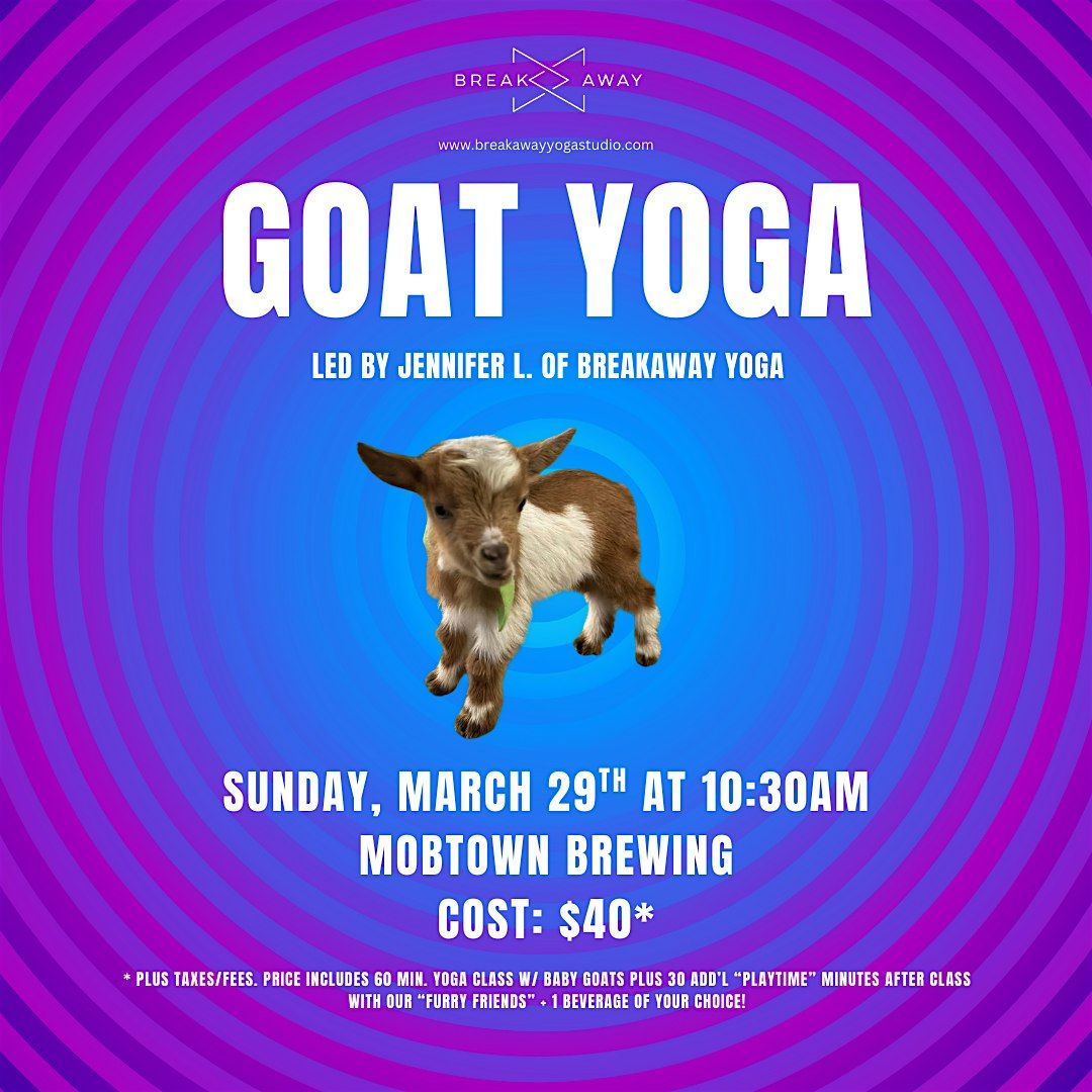 Price includes a 60 min. all levels and welcoming yoga class with BABY GOATS followed by extra time to spend with our "furry yoga partners" and a beverage of your choice (alcoholic and non-alcoholic options included)!