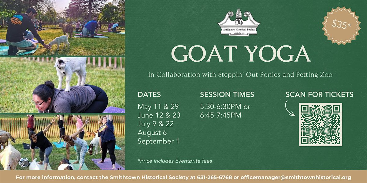 Together with Steppin’ Out Ponies and Petting Zoo, the Smithtown Historical Society brings you Goat Yoga!