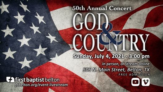 Join us for the 50th annual God and Country concert on Sunday, July 4th, at 3:00pm in the First Baptist Belton worship center. The worship choirs from First Baptist Belton, Taylor's Valley Baptist and Eastside Baptist Church in Copperas Cove will be accompanied by our orchestra. The event is free. Come enjoy a great afternoon of music as we celebrate God and our country.