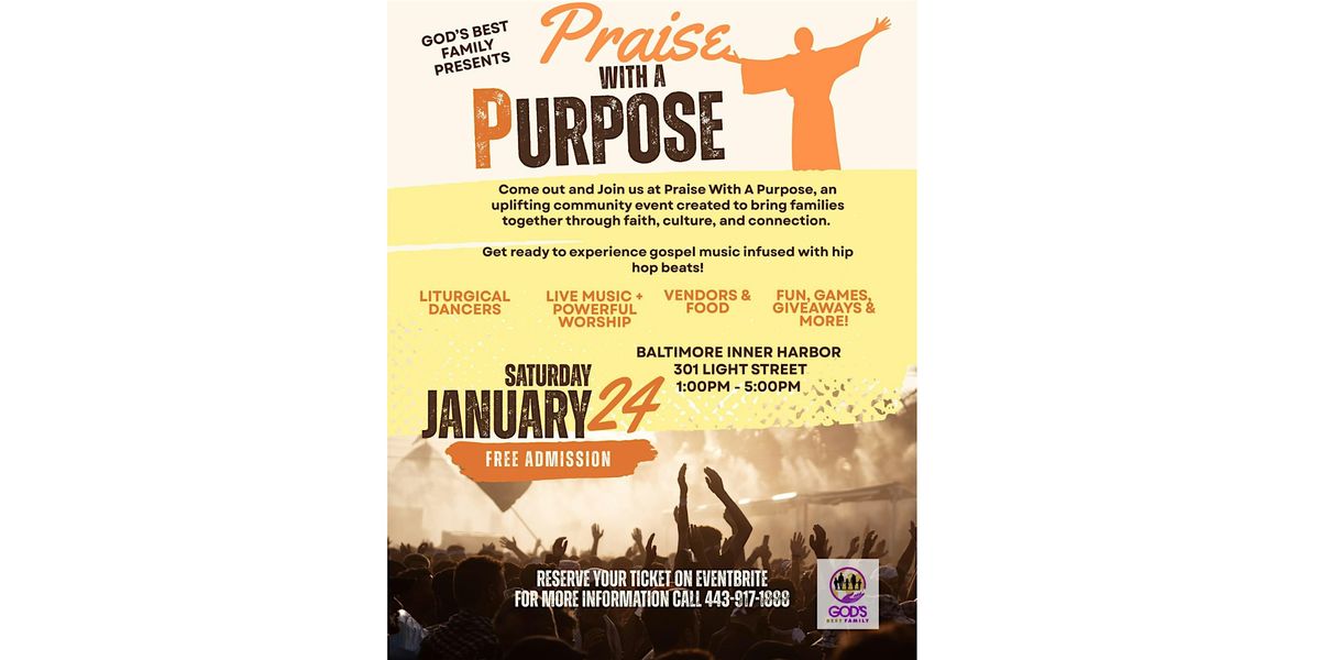 Come experience Praise with A Purpose, a dynamic community gathering designed to unite families through faith, culture, and meaningful connection. Enjoy an inspiring blend of gospel and hip-hop that creates an atmosphere of praise, joy, and togetherness. Invite your friends, bring the whole family, and join us as we celebrate with purpose and make a joyful sound together.