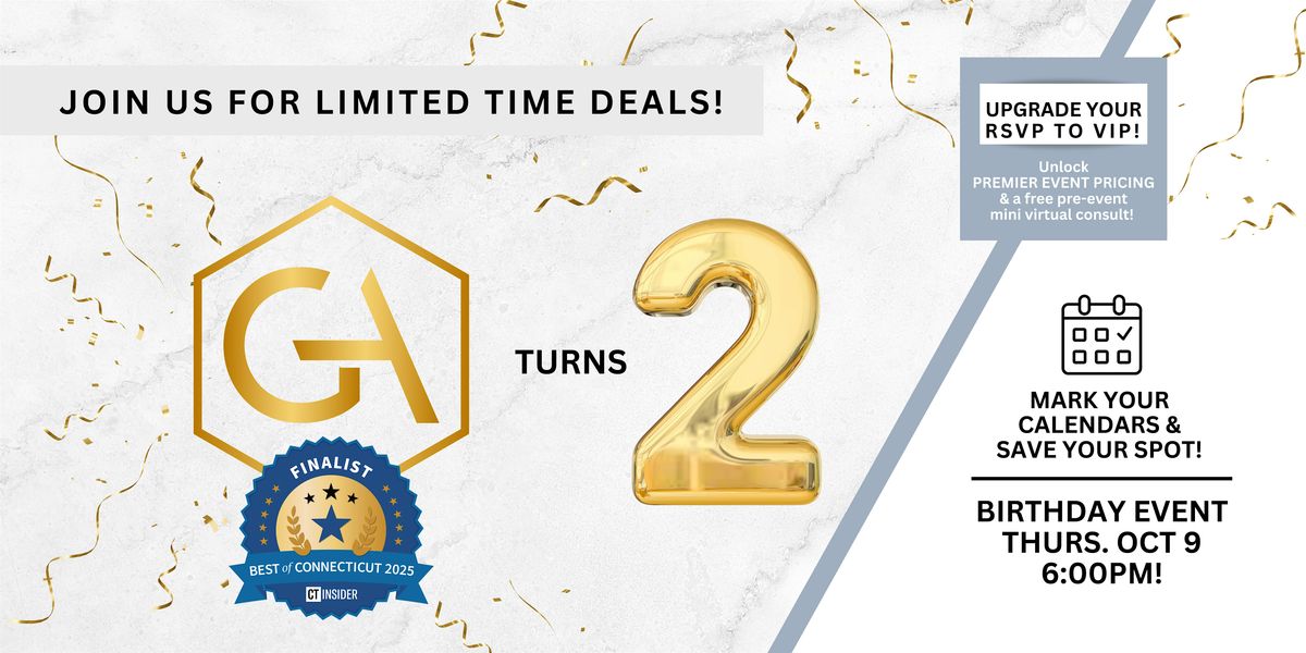 Welcome to the Golden Aesthetics 2nd Anniversary celebration! Join us at our location for a day filled with special promos, mini consults (functional medicine & aesthetics - limited availability), themed mocktails & cocktails, light bites, learning and more. This in-person event is the perfect opportunity to meet our team, explore our facilities, and learn more about what we do. Whether you're a long-time client or new to the Golden Aesthetics family, we can't wait to celebrate with you! Don't miss out on this exciting milestone - mark your calendar and get ready to party with us!