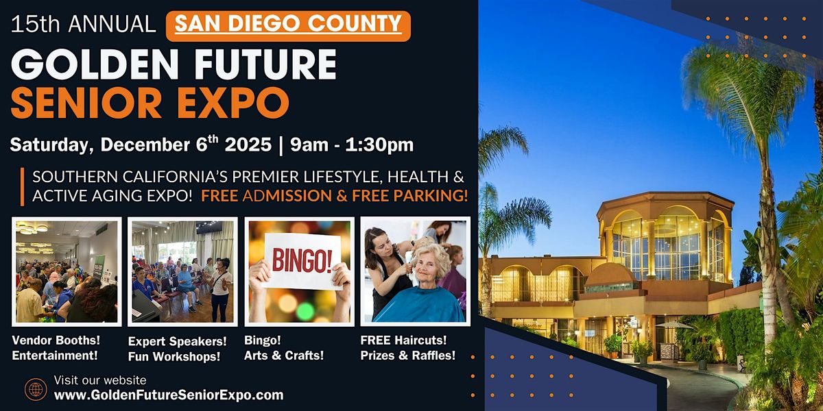 ๐ Date: Saturday, December 6th 2025๐ Location: Handlery Hotel (950 Hotel Circle North, San Diego, CA 92108)โฐ Time: 9am - 1:30pm๐ ADMISSION & PARKING: FREE!Whatโs waiting for you?๐ Golden Ticket Giveaway โ Win Big! ๐! Every attendee will receive a 15TH Anniversary Special Edition Tote Bag. 5 Golden Tickets will be randomly placed in the tote bags. Five Lucky Winners will take home a $100 Gift Card! Will YOU be the lucky one?โจ Incredible Exhibitors โ Explore the latest in health, finances, lifestyle, and much more!๐ฉบ Free Health Screenings โ Stay on top of your wellness.๐ฐ Financial & Retirement Advice โ Plan your Golden Years like a pro!๐ถ Live Entertainment & Activities โ Music, games, and fun to keep you smiling.๐ Giveaways & Prizes โ Because who doesnโt love free stuff?๐ก Educational Seminars โ Get expert advice on on aging related topics!๐ซ Meet New Friends & Connect โ Discover local resources and expand your social circle!๐๏ธ Shop & Explore โ Discover senior-friendly products and services.๐โโ๏ธ๐โโ๏ธ FREE Haircuts! โ Look your best with a fresh new style!