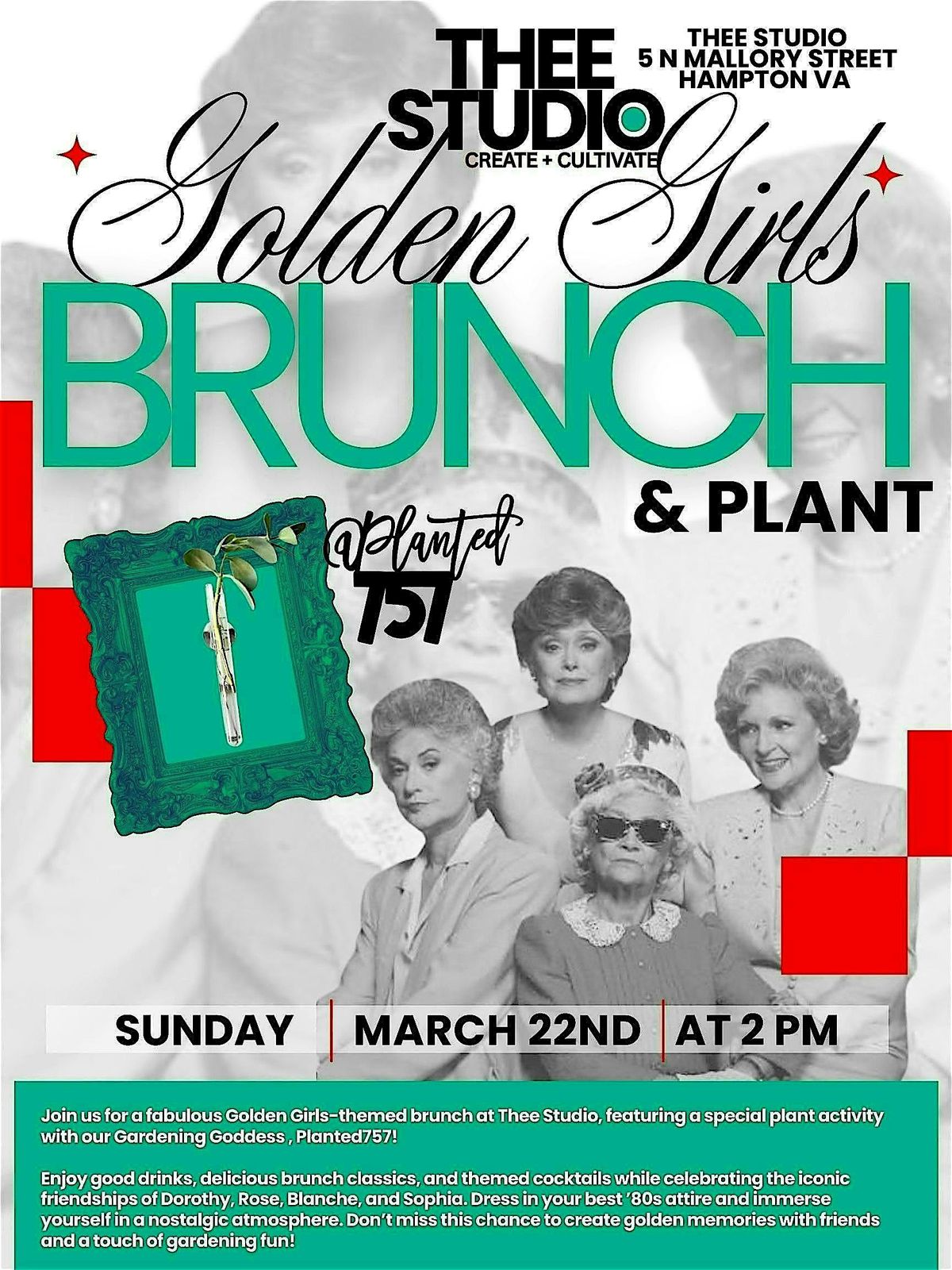 Sip themed cocktails, enjoy brunch classics in your 80's chic attire. Lets celebrate Golden Friendships and create a Planted757 Plantcessory