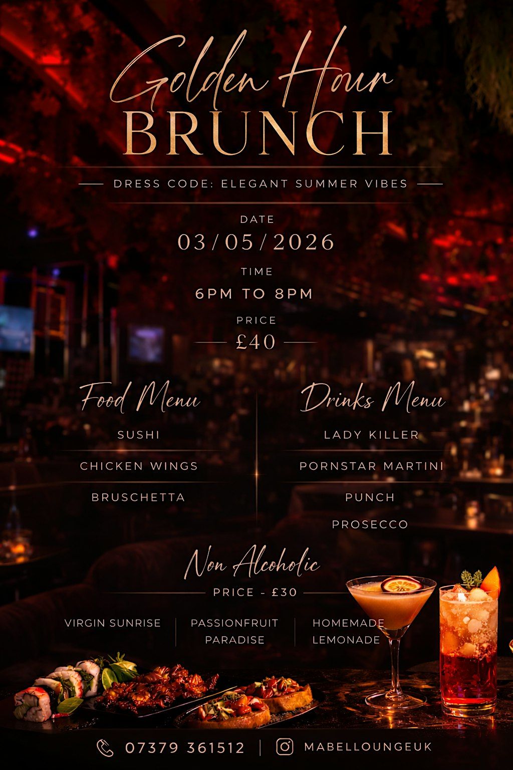 Golden Hour Brunch is a bottomless brunch dinner experience designed to capture the very start of summer. Set inside a stylish shisha lounge, this is where elegance meets good energy as the sun sets and the evening begins.