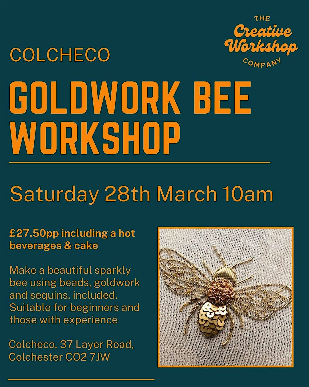 Join us at Colcheco for a relaxing and creative afternoon making a beautiful sparkly goldwork bee. You’ll learn how to use beads, sequins and goldwork techniques to create a detailed, shimmering bee design - perfect to frame, gift, or turn into a brooch or decoration.