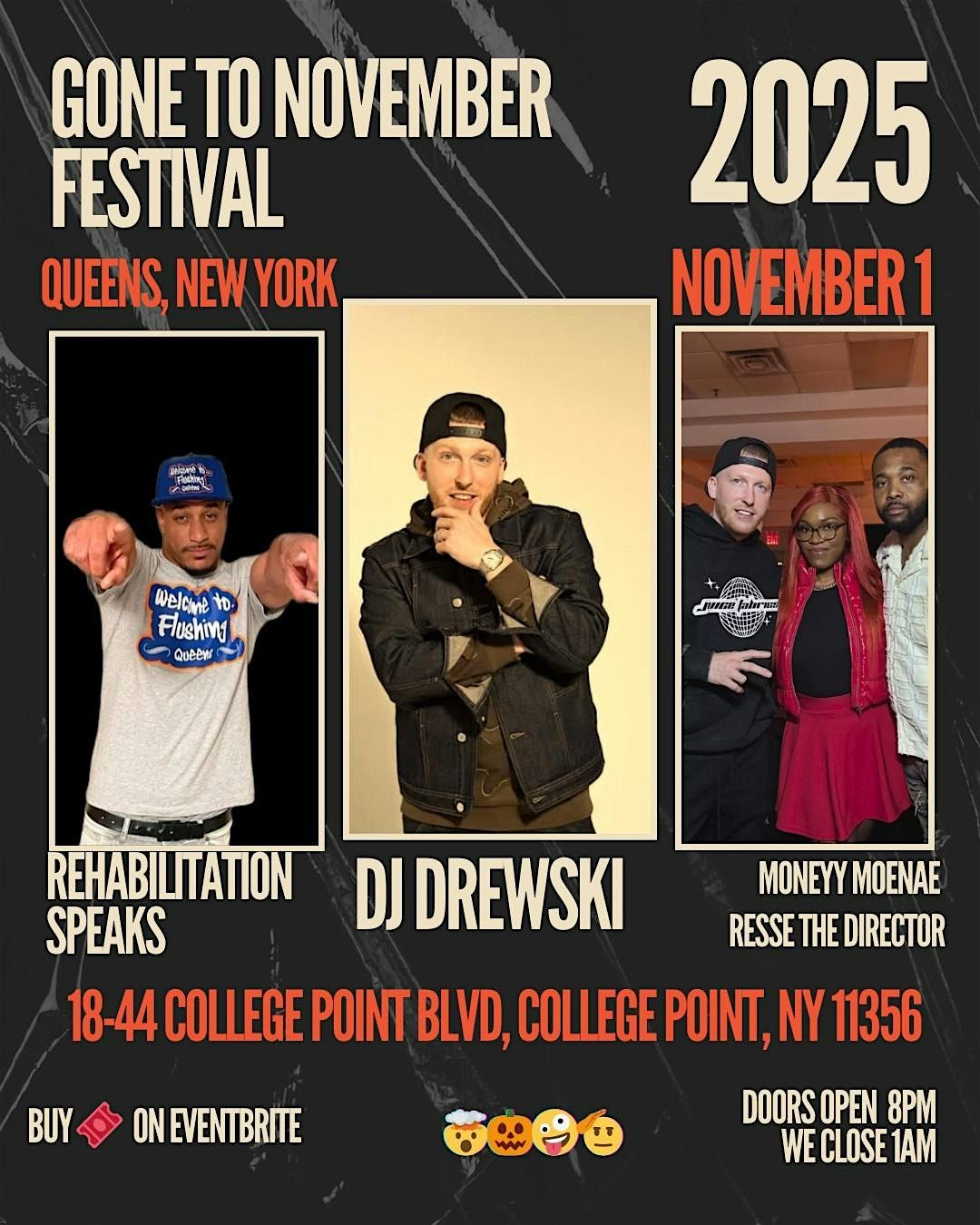 Get ready for an unforgettable night of music and fun at the Gone To November Showcase! Join us on Saturday, November 1 at 18-44 College Point Blvd., in College Point, Queens, NY, 11356 USA. We're bringing together some of the most talented artists in the industry for a high-energy performance that will leave you wanting more!