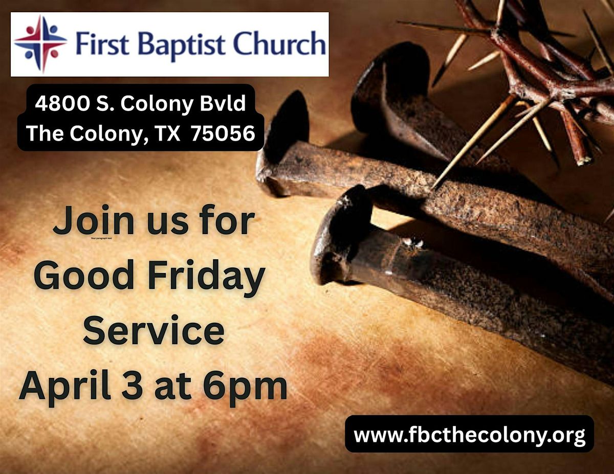 🗓 When: Friday, April 3rd ⏰ Time: 6:00 PM 📍 Where: First Baptist The Colony 4800 S Colony Blvd, The Colony, TX
