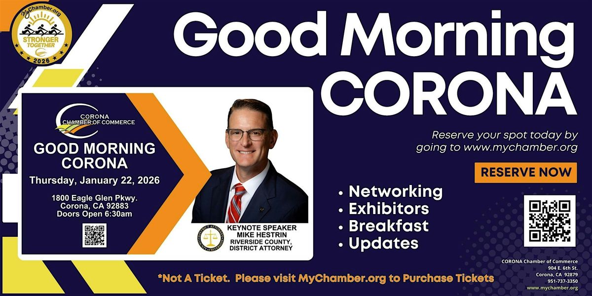 Good Morning Corona featuring Riverside County District Attorney Mike Hestrin brings together the business community for a morning of networking, local updates, and valuable insights. Join us as District Attorney Hestrin shares key updates from the County, discusses current initiatives, and highlights important issues impacting our region. Start your day with connection, knowledge, and community engagement.