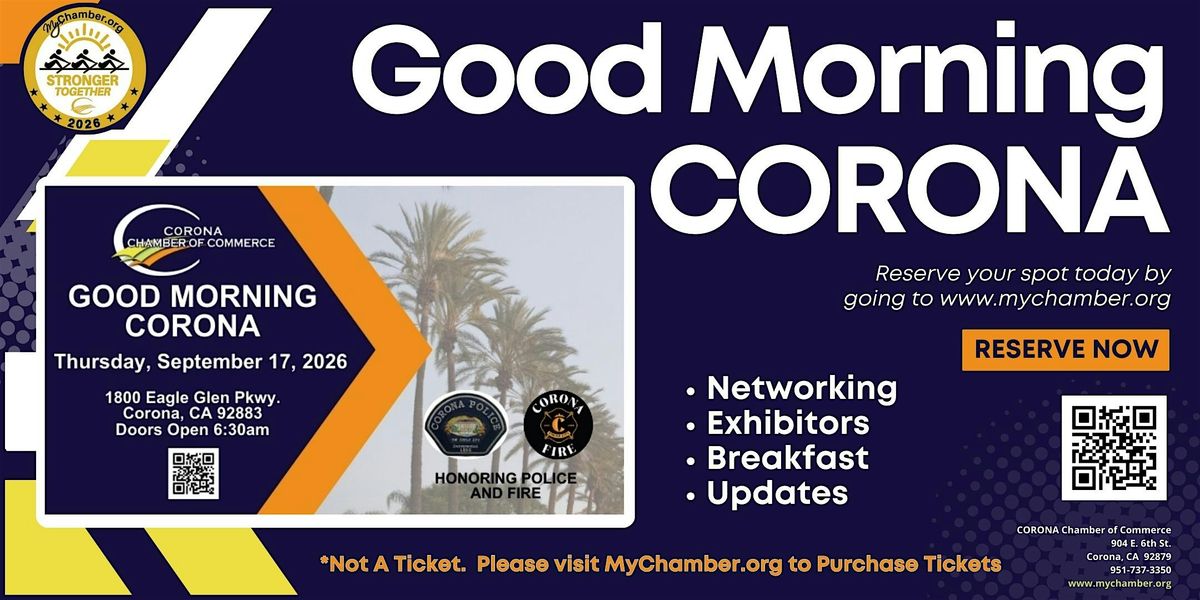 Start your day at Good Morning Corona with networking, updates, and insights impacting our region. Tickets at MyChamber.org