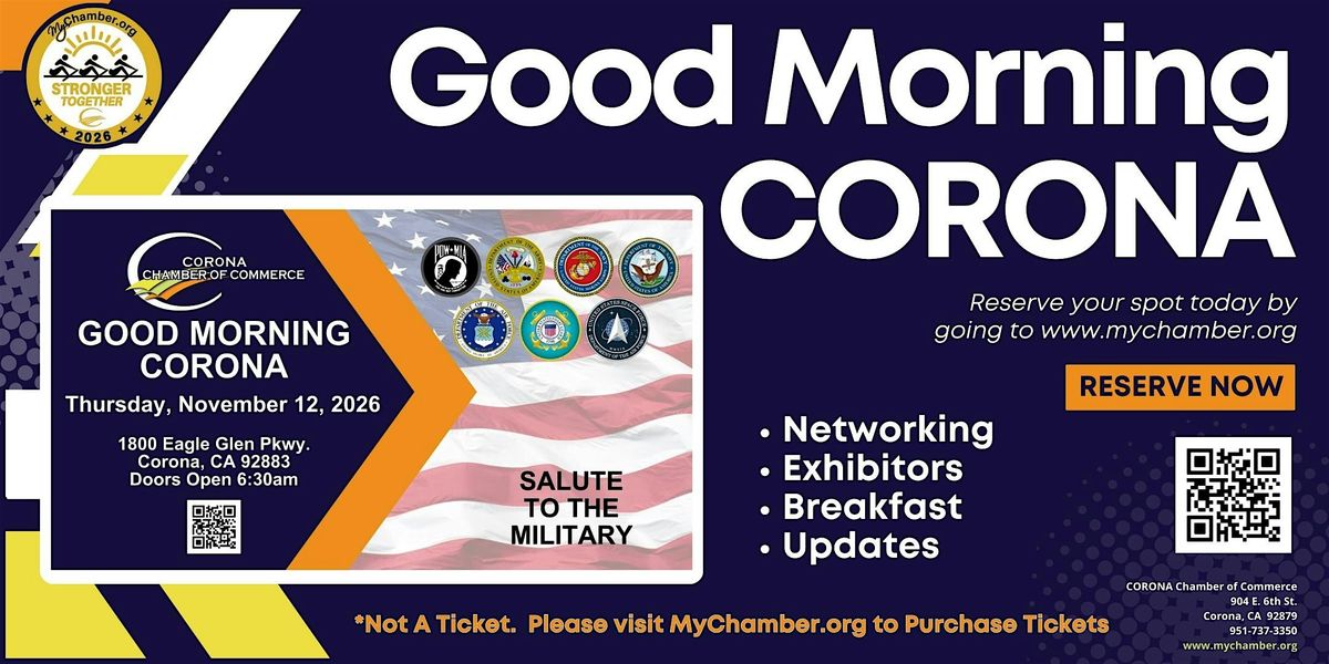 Good Morning Corona: Salute to the Military brings together the business community for a morning of networking, updates, and gratitude. In recognition of our military & service members, we will highlight local branches, share impactful stories, and explore opportunities to engage and support our veterans and active-duty members. Start your day with purpose, connection, and pride. Purchase tickets at MyChamber.org